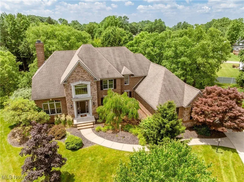 Stately brick & stone colonial situated on a quiet, tree-lined cul-de-sac in the esteemed St. James Place subdivision of Lake Township. Enter into the welcoming foyer which connects to a living room on the left (currently used as a play room), office/library on the right, and continues on to the sprawling eat-in kitchen with an island, breakfast bar, SS appliances, a walk-in pantry, granite counters, and ample cabinet space. Adjacent to the kitchen is the breathtaking Great Room, adorned with cherry built-ins, a stone fireplace (gas), a princess balcony, and a magnificent wall of windows, offering serene views of the multi-tier deck and lush back yard. Tucked behind the kitchen and connecting to the dining area is the cozy den, with its own gas fireplace. The main level is rounded out by a powder room, laundry, and the Primary Suite with his & her closets and the large bath with a jetted garden tub, walk-in shower, and separate vanities adjoined by a dressing table. Upstairs are 3 additional spacious bedrooms, 1 with an ensuite bath and the others with a Jack & Jill bath. The extensive walk-out lower level offers over 1,500 square feet of additional finished living space, with a game room, sitting room, dining area + bar w/seating, workout room, and tons of space for storage. Attached, side-facing 3-car garage & oversized driveway. Newer HVAC, water softener & tankless water heater all within the last 5 years. You will be wowed by the quality of construction - featuring stunning original woodwork, crown moulding, built-ins, and gleaming hardwood floors - schedule your showing today!