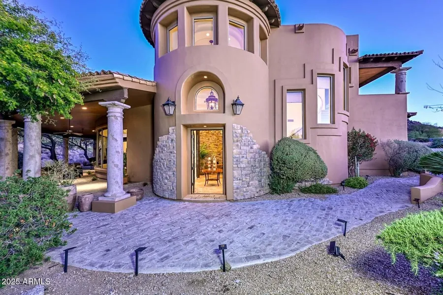 The privacy and elegance of Pinnacle Canyon, coupled with the spaciousness of a Tuscan estate. ''Old World Charm'' with spectacular mountain views from the Media room balcony and the 360 degree views offered from the roof top deck. This custom home features 3 bedrooms, 4.5 baths and a Media Room in the main building, plus a separate guest Casita. The kitchen is equipped with a Sub Zero refrigerator, stainless steel Viking appliances, generous slab granite island countertops and loads of cabinet storage. The Primary Suite features a fireplace, Walk-in closets, separate shower and jetted tub. Other bedrooms feature in-suite bath with jetted tubs, granite countertops and walk-in closets. The outdoor entertainment area includes a sparkling pool/spa/outdoor fireplace and barbecue.
