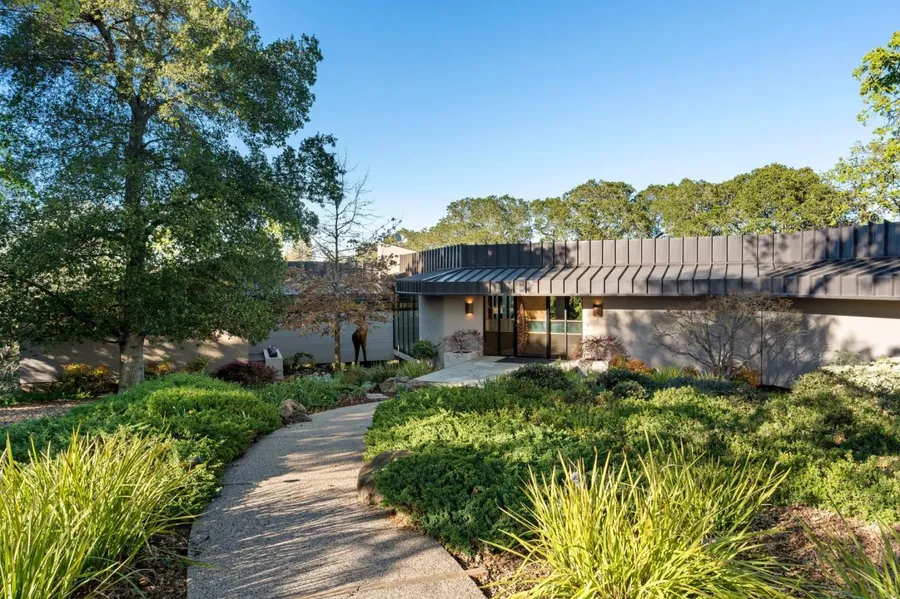 PRIVATE TALIESIN WEST MASTERPIECE ON PREMIER CUL-DE-SAC | Surrounded by tranquility & natural beauty in scenic Los Altos Hills, this single-level residence on a prized cul-de-sac offers a world of quiet, contemporary refinement. Architectural interiors maximize natural light & access to the grounds, creating indoor-outdoor harmony throughout. Two sets of open-concept gathering areas flank an expansive island kitchen boasting high-end appliances. The private bedroom wing provides twin secondary suites & a primary retreat with sky-lit dressing room, spa-like bath, fitness room. Outdoors, multiple decks and a barbecue overlook sprawling grounds studded with majestic oaks. Upgrades in 2018 included a custom standing-seam roof & walls of dramatic conservatory windows. Stroll to trails & enjoy quick access to Palo Alto Hills Country Club & acclaimed schools like Nixon Elementary, Ellen Fletcher Middle, & Gunn High (buyer to verify).