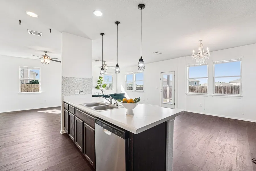Discover exceptional privacy in this spacious two-story residence, perfectly situated on a premium lot with no rear neighbors in Buda's desirable Shadow Creek community. Enjoy serene, private views, creating a peaceful retreat right in your own backyard. Inside, the home welcomes you with a highly functional open-concept floor plan designed for modern living. The main level showcases rich hardwood flooring, creating a warm and continuous flow through the living, dining, and kitchen areas. The expansive kitchen serves as the heart of the home, equipped with stainless steel appliances, dark wood cabinetry, a large breakfast bar with pendant lighting, and ample counter space for prep and serving. The thoughtful floor plan features multiple living areas, including a spacious upstairs flex space, ideal for a media center, game room, or play area. The generous primary suite is a private haven, featuring a spacious walk-in closet and an en-suite bathroom complete with a dual-sink vanity and an oversized walk-in shower with a tile surround and bench seat. Storage is plentiful throughout the home. Step outside from the living area onto the covered patio, perfect for grilling or relaxing while overlooking the private, fenced backyard. The property includes a full in-ground sprinkler system and an attached two-car garage. Living in Shadow Creek offers a fantastic lifestyle. This vibrant community provides residents with access to top-tier amenities, including a sparkling community pool, playscapes, sports courts, and extensive walk/bike/hike/jog trails. The location is exceptionally convenient, just moments from I-35 for easy commutes to Austin and San Marcos. This home is also zoned for highly-rated Hays CISD schools. This home combines a private, nature-backing location with significant interior upgrades and access to world-class community features.