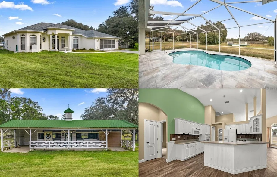 Under contract-accepting backup offers. Amazing POOL HOME nestled in the prime and highly sought-after area of Southwest Ocala! This exceptional 3-acre agricultural property is a private oasis with no restrictions, offering endless possibilities. The 3-bedroom, 2-bathroom home features an open-concept split floor plan filled with natural light, high ceilings, and expansive windows. The spacious owner s suite offers a serene retreat with direct access to the lanai and pool area, perfect for enjoying your private outdoor oasis. The large guest bedrooms provide ample comfort, and the laundry room offers plenty of space for storage and convenience. The kitchen, with abundant cabinet space, flows seamlessly into the family room, making it ideal for entertaining. A standout feature is the enclosed lanai with bypass doors that fully open, creating a seamless connection between indoor and outdoor living spaces and leading to the enclosed pool area. Relax and enjoy tranquil views of open spaces and pastures in complete privacy. Equestrian enthusiasts will love the barn, which includes two spacious 12x12 stalls, a tack area, and a feed room. Additional amenities include a 12x24 air-conditioned workshop, a charming doghouse with its own AC unit, and an RV port located at the back of the property. Conveniently located near shopping, hospitals, and restaurants, this property is only a short 10-mile drive to the renowned World Equestrian Center. Combining comfort, practicality, and rural charm, this extraordinary property is a true gem. Schedule your private tour today! ROOF 2023!