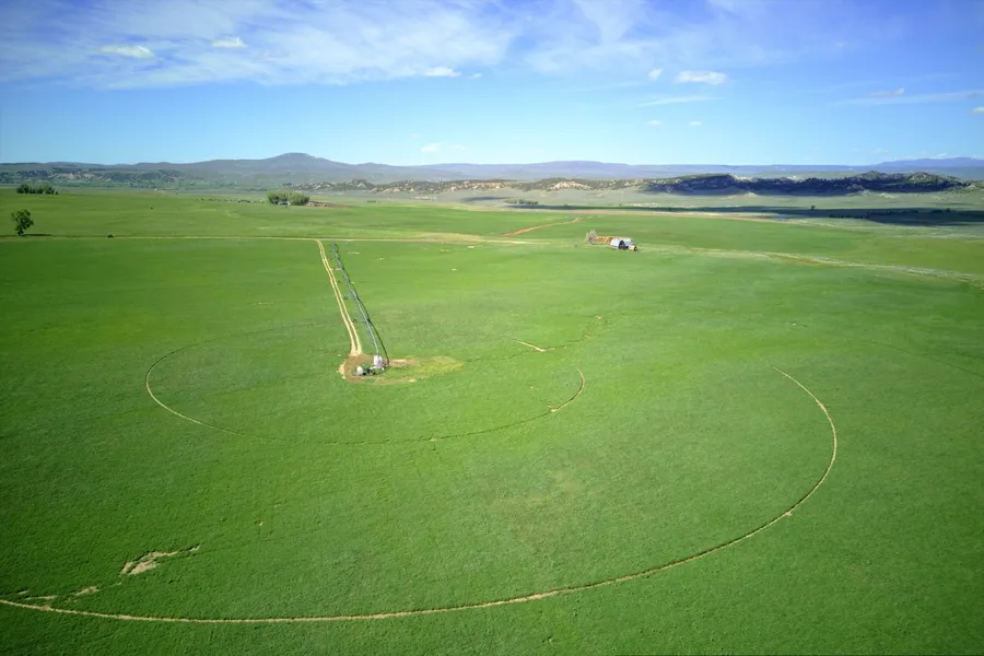 With 2942 +/- acres (970 in Wyoming and 1920 in Colorado), this unit is made up of a combination of two irrigated pivots covering approximately 370 +/- acres of alfalfa grass mix hay ground and large sagebrush and native grassland pastures. The pivots are serviced by wells with good producing power and electric motors. One pivot is a 13-tower, and the other is an 8-tower. The headquarters has a long list of good improvements.