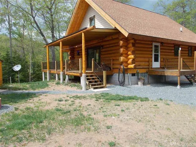 Log Home on 60 waterfront acres in Marquette County's north country. Go off the grid and on to amazing. A Koski Log Home is known for the huge hand peeled, air dried logs and masterfully engineered roofing system with an R factor of over 50 preventing heat loss and withstanding snow loads. This finely crafted log home is one of the finest you will find on the market. The logs are "9 round" meaning there are 9 logs to the wall. The huge log interior beams span the length of the cabin over which is the soaring vaulted ceiling. There is a log staircase leading to the upstairs loft used now as a bedroom but could also double as an office or studio. The main floor features a bedroom, bath, laundry area, kitchen, dining and living room in an open area concept. The basement is unfinished but serves as excellent storage and utility area. This is a walkout so is very useful for many applications including additional living space. While the Log Home is the centerpiece feature of this property the land is awesome. Mostly high, rolling hills with mixed northern hardwood stands including black cherry and interspersed with pine there are old growth oaks and white pine on the property. The cabin is on ridge with the trout stream flowing below within sight of the wrap around, partially covered deck where you can literally watch your friends and family catch native brook trout. Along with the forest, the grounds feature a level yard with a thriving orchard of apple, pear and cherry. The fenced in garden is growing too. There is also a generator shed, a small storage shed and two large container sheds that can hold a small truck, tractor and ATVs, very handy. This entire setting is very pleasing, useful and well, fruitful. The property would make a luxury seasonal cabin for hunting, fishing or just relaxing. It would also be an awesome year round off the grid home with acreage that you can garden, pick fruit and berries, fish, cut firewood, hunt and live comfortably in your fabulous log home. This home is complete with a drilled well, septic, on demand water heater, and is powered with solar augmented with a back up generator. All of this makes self sufficiency a real term in real times that are now so important. This is comfort, this is enjoyment, this is security. With the Log Home, the towering oaks, the trout stream, the woodlands the yard and many amenities, this off the grid cabin will serve your needs for years to come.