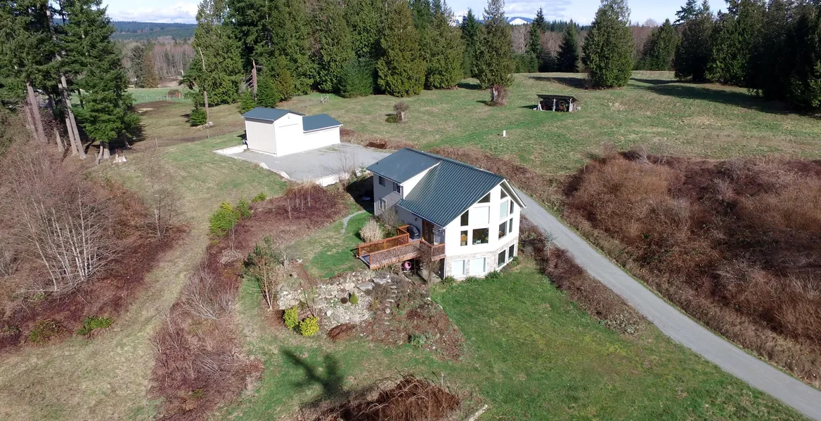 Environmentally sensitive home with det. garage/shop on beautiful cleared acreage. Privacy, convenience and sustainability. Nuts, berries, fruit trees, vegetable/flower beds and hen house. Light filled common areas on the main floor, open arched stairway w/library shelves to airy loft and master suite. Office/walk in closet off the master has 5 piece bath, 2 bds, 1 ba on the main, huge rec/family room below with walk in pantry/wine room and mech. room has 1000 gal. water storage. Nature abounds.