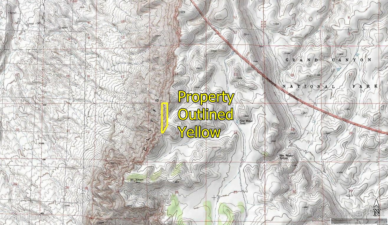 This property is an actual part of the legendary cliff face. It is located about 1.5 miles from Grand Canyon National Park and is east of Meadview and Grapevine Mesa. It borders Bureau Of Land Management land on its north side, and Grand Canyon National Park is less than 1.5 miles away. The legal description of this property is Mohave County, Hualapai Highlands, Unit 23-30-16, Lot A.
