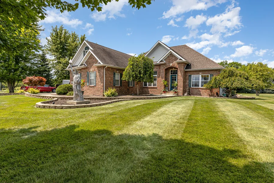 Welcome to this stunning ranch home nestled on a picturesque 1.22-acre lot, offering a perfect blend of luxury and comfort. As you step inside, you'll be captivated by the Brazilian Cherry Hardwood Floors, Elegant -4- piece crown molding, and impressive trayed ceilings throughout. The updated kitchen is a Chef's Delight, featuring Custom Maple Cabinets with Attractive Crown Molding , SOLID Granite Countertops, and Like New Stainless Steel appliances. With 3 spacious bedrooms and 2 full baths, there is ample space for everyone. The primary bedroom is a serene retreat, an en-suite bathroom with a walk-in closet, his and hers vanities, a porcelain tiled shower, and a large soaking tub. The living room offers BOSE surround sound speakers, and the focal point is the gas/wood burning fireplace with classic wood mantle and raised hearth to warm up those winter nights! The GIANT Ready-To-Finish basement is a blank canvas, equipped with two sump pumps and pre-plumbed for a full third bathroom. The outdoor space is nothing short of a resort, boasting a custom outdoor kitchen, an outdoor fireplace, Speaker System, and multiple seating areas - perfect for hosting and entertaining. The property includes a 2.5-Car Attached Garage and a Second HUGE Garage with heated floors and air conditioning, ideal for a workshop or creative space. Plus this exceptional home includes the convenience and peace-of-mind on a whole-house Generac Generator System [17-KW]! Located on a peaceful cul-de-sac in a great subdivision with low taxes, there is so much to enjoy in this wonderful estate. And yes, the Statue of Liberty stays along with the 40ft commercial flagpole! This home is a rare find, offering Luxury Living with unparalleled amenities.