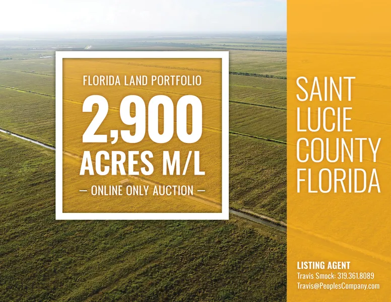 Incredibly rare opportunity to own 2,900 contiguous acres m/l of productive land with endless potential near Floridas eastern coast. This former citrus grove property has approximately 2,000 acres that have been cleared and precision leveled with engineered internal ditching, all of which is currently in fallow allowing immediate preparation to plant the next crop. An additional 640 acres m/l on the north end are citrus groves in various stages of clearing. The property consists of 2,652.97 acres considered cropland by the St. Lucie County FSA Office, of which 80 acres m/l is currently utilized as a reservoir and approximately 2,325 acres are net tillable land. Multiple water sources include a canal along the western boundary, two reservoirs, as well as permitted and surface wells. In addition to extensive irrigation improvements, the property has been developed to assure rapid drainage in the event of excess rainfall. On top of the future development potential for both residential and solar fields, the location just 3 miles from I-95 and mile from Floridas Turnpike between the Atlantic Ocean and Lake Okeechobee provides this property the perfect climate and access for multiple crop varieties including row crops such as corn and soybeans, vegetable production, and citrus groves.