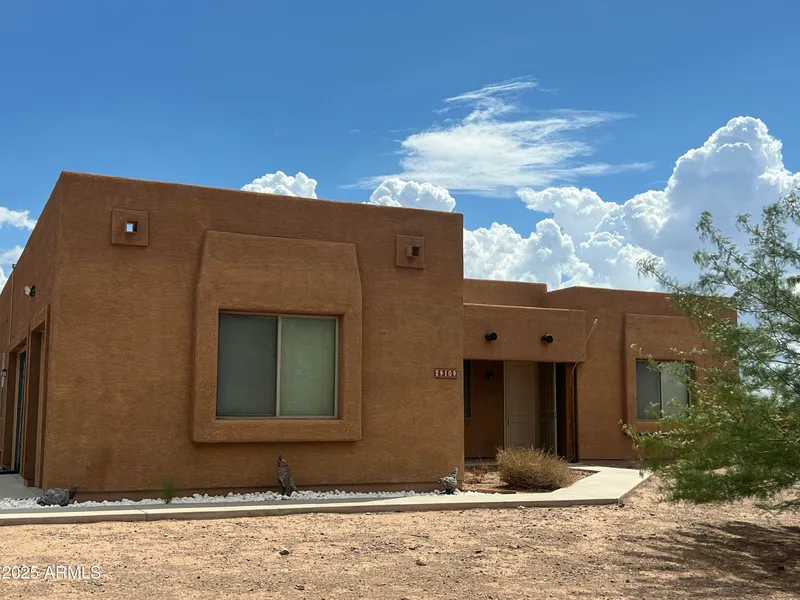 Come enjoy the Arizona Desert. This 4 bedroom 2 bath has just under 2000 sq ft and is only 9 years old. The over 1 acre lot has a block fenced backyard with an RV gate. Home has leased solar and large tiles for all the high traffic areas. Beautiful kitchen with dark cabinets granite countertops and new Appliances. A small dog run in the backyard that is also fenced. The bedrooms are split from the owners suite. This home also has a 3 car garage plus a storage shed in the backyard.