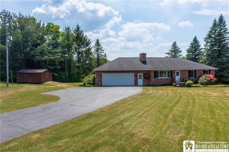 BACK ON THE MARKET - previous purchaser unable to close due to unexpected personal issues. Title work and survey already completed so closing can move along quickly. This beautifully updated 4BR home is located on approx. 8 acres in the Bemus Point School District. Also including a 56' x 40' custom built barn w/ fully insulated walls and ceiling, full liner panels on walls and ceiling, 6 in. concrete floor and 12' + 14' overhead doors. The house features a brand new kitchen w/ brushed quartz countertops and all new cabinetry in the kitchen and primary bathroom. New LVT flooring throughout the main floor where you'll find 3 bedrooms and 2 full baths. The living room has a wood burning FP and views of the Moonbrook Country Club Golf Course. The kitchen leads to a spacious sunroom w/ vaulted ceilings and sliding glass doors to the multi-level Trex deck and private backyard. The walk-out finished basement includes the 4th bedroom, a full bath, large family room, office and lots of storage space. There is also an oversized, attached 2.5 car garage. Utilities include Jamestown BPU electric and natural gas.