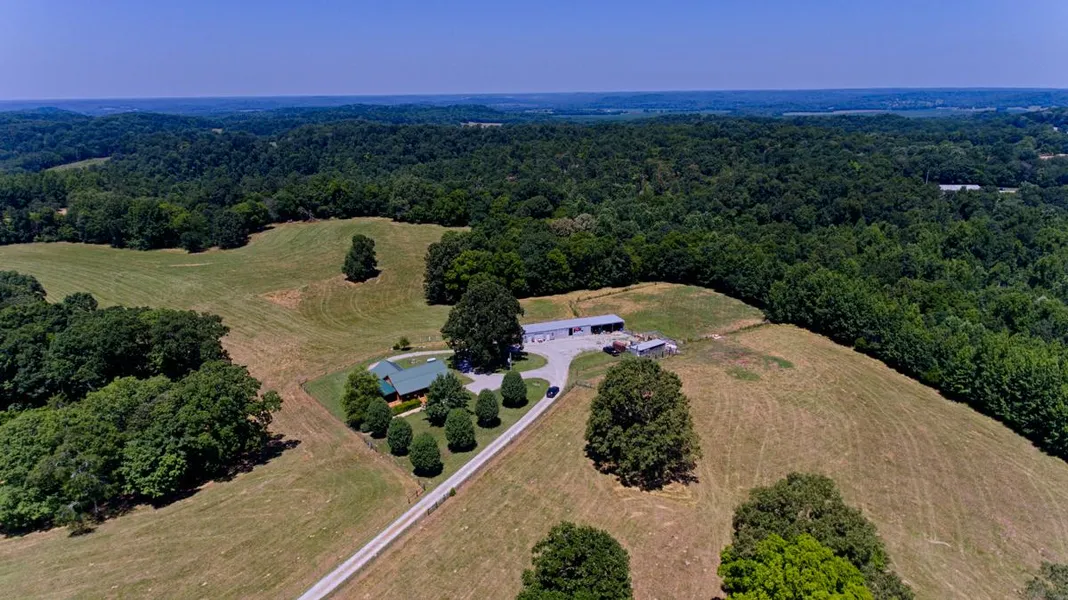 34.7 Acres and 2412 sq. ft. cabin with Cedar Log siding, main floor offers ceiling fan, vaulted ceiling, solid wood knotty pine doors, slap cedar, pine plank walls, spacious kitchen with many built-ins, gas top cook stove, replica wood heater uses propane, LVP Flooring. One bedroom upstairs with in suite full bath with jetted tub, separate shower, twin vanities, Downstairs, pool table, gun safe remain. One bed, possibility of other bed room, one bath. Completely fenced 5 strand & net wire for cattle or horses, 2 ponds, Livestock Never Freeze watering system. 108x24 tire shop with 1/2 bath. Mostly Oak, Hickory and Poplar in wooded areas. Mostly Pasture. Hunters paradise for Deer and Turkey.