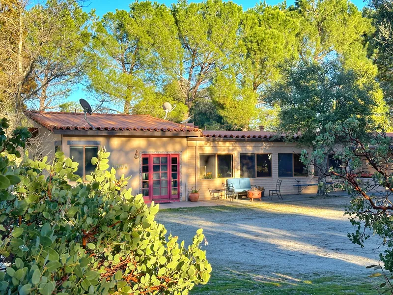 With over 65 usable grass and oak-studded acres, this old-world-inspired home and horse ranch is definitely the cure. Leave town behind and join us up where you belong, in the mountains of Warner Springs. Travel down your private pine tree-lined driveway to a fenced and gated five-and-a-half-acre spread. Your home has two bedrooms and two full bathrooms, the perfect kitchen design according to experts, a warm, livable living area, and an attached 4-car garage (currently used as a massive fun and guest room but easily converted back to garage space if so desired). We love the antique plaster look and nostalgic details of the home's exterior, down to hand-selected art pieces and Spanish tiles edging the very practical metal roof. A few steps away, just beyond some magnificent boulder formations, are the storage and tack sheds, a 4-stall horse barn, a round pen/arena, and a pasture with a run-in shelter. Beyond the fenced homestead lies the rest of the acreage, which has been carefully maintained to showcase this area's most spectacular natural beauty and vistas. There are miles of trails for riding and hiking within your land, up along a rocky ridge, down through meadows, and past a private pond - a favorite respite for local critters. Your ranch features two currently active water wells and two additional ones not in use at this time. You'll find the well water here to be one of our most treasured and precious resources! It's delicious and unspoiled. There are over 20,000 gallons of water storage up on the ridge overlooking the ranch, so even in times of no power, you and yours can remain healthy and hydrated. And if 65 acres isn't enough, the ranch backs up to thousands of acres of public lands. You can also ride directly from your home without trailering and almost instantly be on the California Riding and Hiking or Pacific Crest Trails, which run from Mexico to Canada directly through this community, not to mention the Dr. Bronner's AOGF open space preserve, Chihuahua Horse Camp, and more.