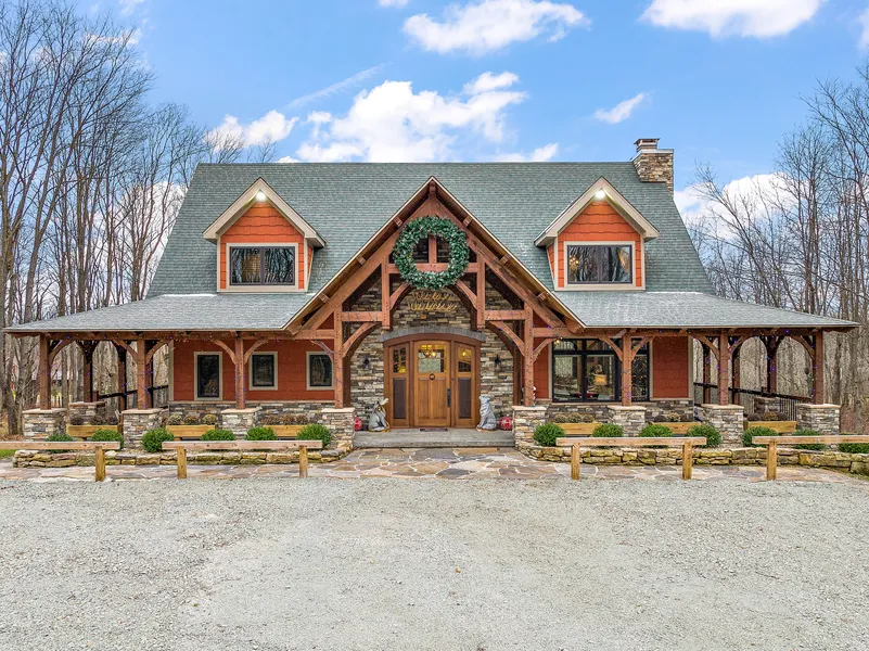 Affectionately known as "The Christmas House", this three years young custom-built chalet sits on five tabletop acres in the heart of the Laurel Highlands. Highlights include luxury finishes at every turn, full timber construction, four private en suite bedrooms - including a main level primary suite, a unique two-level loft, 27' tall stone living room fireplace, finished basement with a personal in-home theater, an incredible deck that wraps around the entire home - complete with an outdoor wood-burning fireplace, covered outdoor dining area, geothermal heating and cooling technology, and a heated three car garage. All just minutes from the Hidden Valley and Seven Springs Ski Resorts, miles upon miles of hiking trails, picturesque state forests, fishing, kayaking, golfing, Ohiopyle, Frank Lloyd Wright's Fallingwater, and so much more. Sold fully-furnished, with everything you see here! Festive, luxurious, and cozy, this mountain home truly has it all.