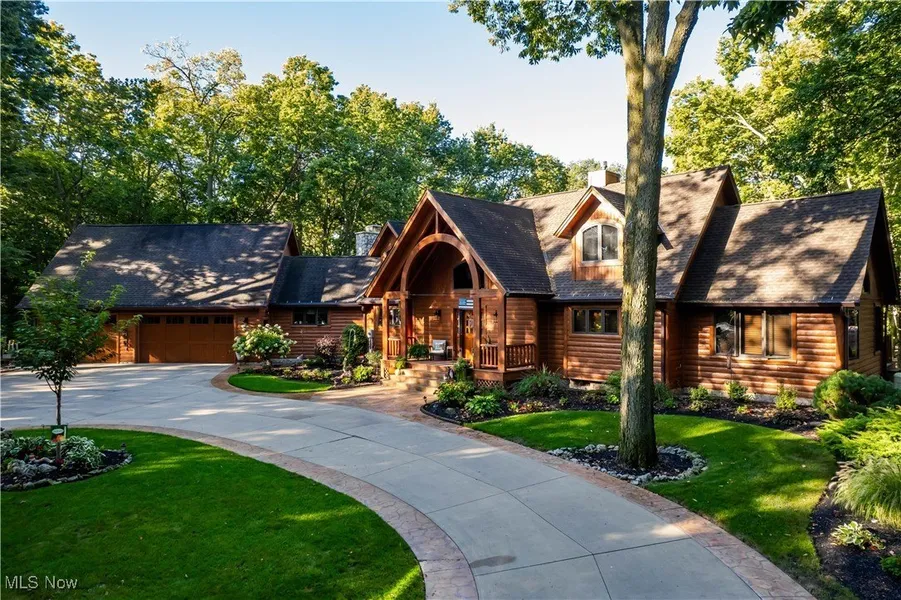 A masterpiece of rustic elegance in The Bluffs situated on a wooded overlook with views of Catawba Island Club and Marina. Impeccably crafted with rough-sawn white cedar logs, flat-cut on one side to blend natural charm with modern convenience. Solid cedar tongue and groove interior log walls/ceilings/trim throughout. Custom three-story staircase with natural log newel posts and railings. The kitchen boasts hickory cabinets, granite countertops, Mannington tile floors, and stainless apps including a large commercial range. A thoughtful wet bar separates the kitchen and dining room while maintaining an open layout. Warm family room with a magnificent stone fireplace. Central two-story great room with 20' beamed ceiling, spectacular window wall, & gas fireplace. Secluded first floor master suite is a true retreat with a separate den/office and private bath with jetted tub, tile shower, and two vanities. Upstairs bedrooms both have private baths, vaulted ceilings, and built-in day beds. Back hallway with huge walk-in pantry, closets, cabinets, and laundry room. Walk-out lower level is partially finished with a craft room and large rec room, plus an unfinished storage and mechanical area. Three-car heated garage has two man-doors and a stairway to a 30x14 nicely finished workshop above. Over 1,000 sq ft of expansive deck space with beautifully crafted log railings and glass balusters. Five sets of doors from the house to the back deck, all with retractable screens perfect for entertaining. Unique zoned heating system combines hidden radiant hot water heat and forced air for optimal comfort and convenience. Newer wall boilers heat the home and hot water for efficiency. Adjacent to Catawba Island Club (membership optional), with an Arthur Hills designed golf course, pools, clubhouses, tennis, marinas, gourmet dining and entertainment.