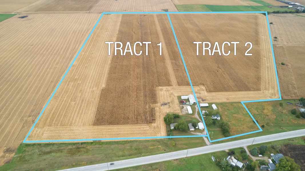 Both tracts have upper 80s CSR2 cropland with two homes and older outbuildings in a commercially zoned area. The property has county tile running from the NE corner heading west. There are no records of lateral tile lines. The land is rented for 2025 but the lease is canceled for the 2026 crop year.