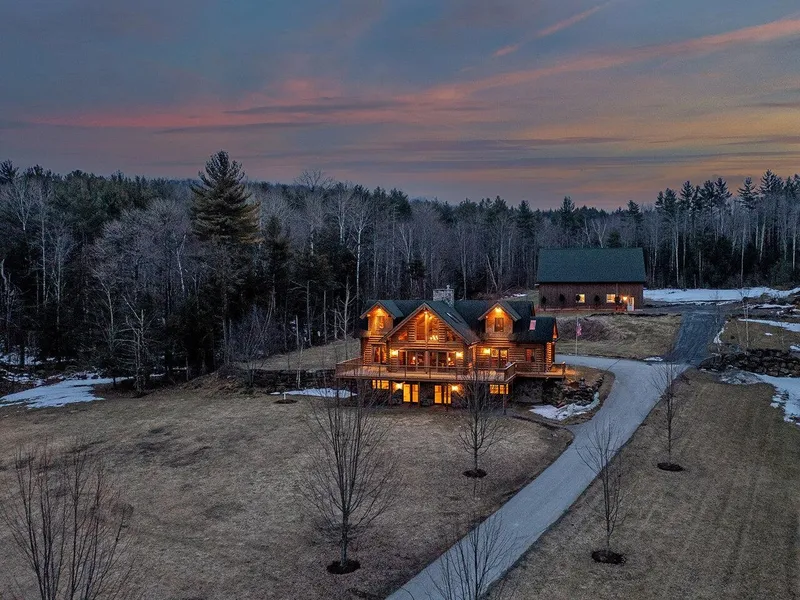Looking for your Vermont dream home? This custom-built Contemporary Log Home nestled on 11 wooded and open acres with pond and fountain offers everything you want and need. Inside you\'ll find a sunny, open floor plan with plenty of room for everyone. The chef of the home will be delighted with the gourmet kitchen offering stainless professional grade appliances, granite counters, and large island with seating. Enjoy the great room with a soaring vaulted ceiling, an abundance of windows, and gas fireplace with gorgeous stone chimney. The primary bedroom suite is conveniently located on the main level and offers a walk-in closet, private bath with tile shower, and access to the front wrap-around deck. Speaking of the deck, you can access it from the great Room and dining room for seamless entertaining from inside to out. A 3/4 bath with laundry rounds out this level. Upstairs you\'ll find two guest bedroom suites with private bathrooms plus a sitting area/office space in the loft. The full walkout basement only needs flooring to be completely finished. It features wood-burning fireplace, storage, and one room is pre-plumbed for a future bath! The entire home including the attached 2-car garage offers radiant heat, plus reduce your carbon footprint with leased solar panels. The property also includes a large outbuilding/workshop to store all of your toys - RV, boat, tractor, extra cars. Private location yet just minutes to many Essex amenities and only 10 miles to Burlington.