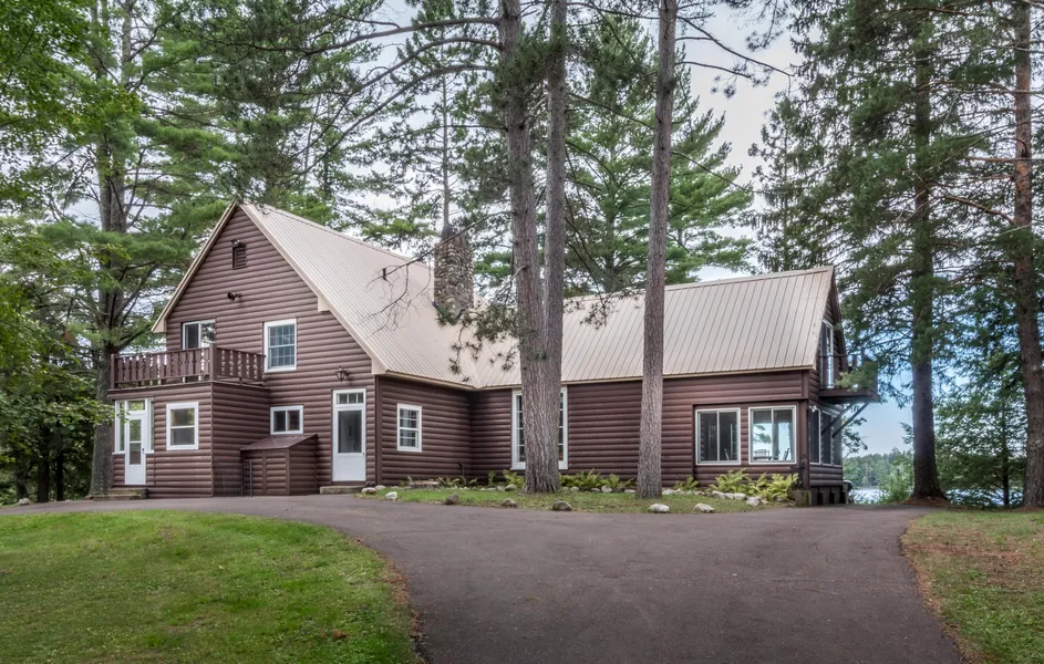 Set high on a prominent point at the end of a large private bay is a true Northwoods wilderness lodge originally built by the Chicago Bismarck Hotel family. This 297 acre property with 15,000+- feet of water frontage on beautiful, and virtually private, Owl Lake, is for those requiring absolute privacy and tranquility. The great room with heavy crossbeams and twenty foot ceilings is complete with woodburning fireplace and breathtaking lake views. Imagine cooking breakfast on the large commercial stove and gathering in the dining room with the original hotel china and stemware. The home includes 5 bedrooms, each with its own deck or screen porch. The second story also includes a library and office space. Six outbuildings including a tackle house, log storage, toolshed, 3 garages, and a 2-bedroom guest cottage.