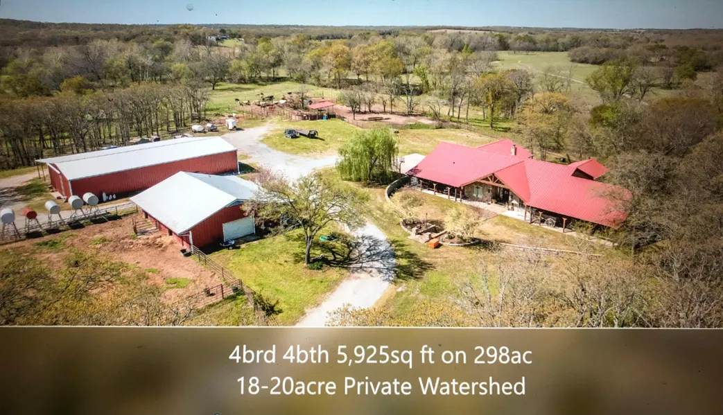 If you've been searching for a Ranch Property that is the Whole Package this is it 18-20mol acre Private Watershed with Cabin, to raising cattle, horses, hunting, fishing and a large home to accommodate the whole family--This 5,925sq ft mol Handcrafted Custom Rustic Home is breathtaking in itself but the oversized Custom Kitchen has it's own love story built into it. See the original owners of this home hired Bob English to construct the home and they cut no corners building their dream home to accommodate their family. As you walk into the grand entry your eyes quickly notice above is a custom antler chandelier, wood ceiling with custom beams which are throughout all the main living area, formal dining area, office or a fifth bedroom and then on to the oversized living room. Large enough to hold large family gathering. The rock fireplace with mantel to warm yourself next to fireplace are large window & glass doors allowing you to view the live creek just in the distance or walk out onto the large deck. After taking in the living area your eyes will quickly be taken by the Kitchen which is a chief's dream, but this is a Kitchen built with a love story. The previous owners whom built this home met in a business in Okc this building was being demolished and the husband purchased all the lumber from the building then asked Mr. English to use this lumber for all the kitchen cabinets, island with granite countertop and oversized breakfast bar which is finished out with a copper countertop. Adjoining the kitchen is a large game room which includes a full size pool table & full size shuffleboard table and windows wrapping the room for natural lighting. Onto to the north wing, custom built-in storage cabinets along the hallway leading to the laundry which has room for extra frig. or freezers & storage cabinets and a door leading out to the balcony. Three large bedrooms on the north wing along with bathrooms and a separate entry off the front porch. Finally onto the main bedroom, bath and oversized walk-in closets. This main bedroom has it's own fireplace, room for a lounge and a door leading onto the back deck to take in your morning coffee or gorgeous Oklahoma Sunsets all this nestled on298mol Acres which includes it's own Private 18-20mol Acre Watershed & Cabin with multiple additional Ponds scattered over the land, Abundant Wildlife-Whitetail Deer 180+ & Turkey, 40x50 Metal Concrete Floor Shop/Horse Barn with 3 stalls, 2 large work rooms, 2 roll up doors & 220amp service- 40x80 Metal Shop Spray foamed insulation 2 large workshop rooms/storage, supplies or tack room, 20x40 Metal Barn in north pasture, this property is crossed fenced with multiple pastures and runs to separate and pen for easy access to working pen & cattle chute. Blacktop road all the way to the property for easy access -- Schedule your viewing today!!!