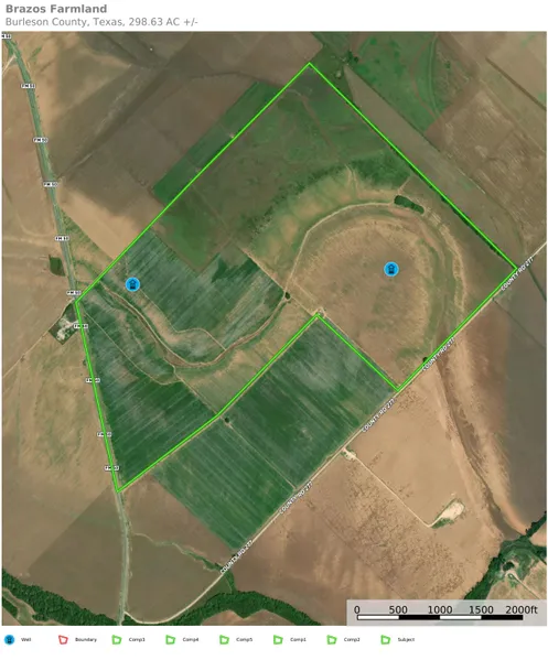 +/-298 acres of fertile cropland available in the Brazos River bottom, this tract currently and historically has been farmed as a mixture of corn and cotton. The tract has good frontage along both FM 50 and CR 277 in Burleson County with great access from both roads. Two shallow wells being fed from the Brazos Alluvium Aquifer are each capable of pumping 400 GPM, not currently in use but have been in the past.