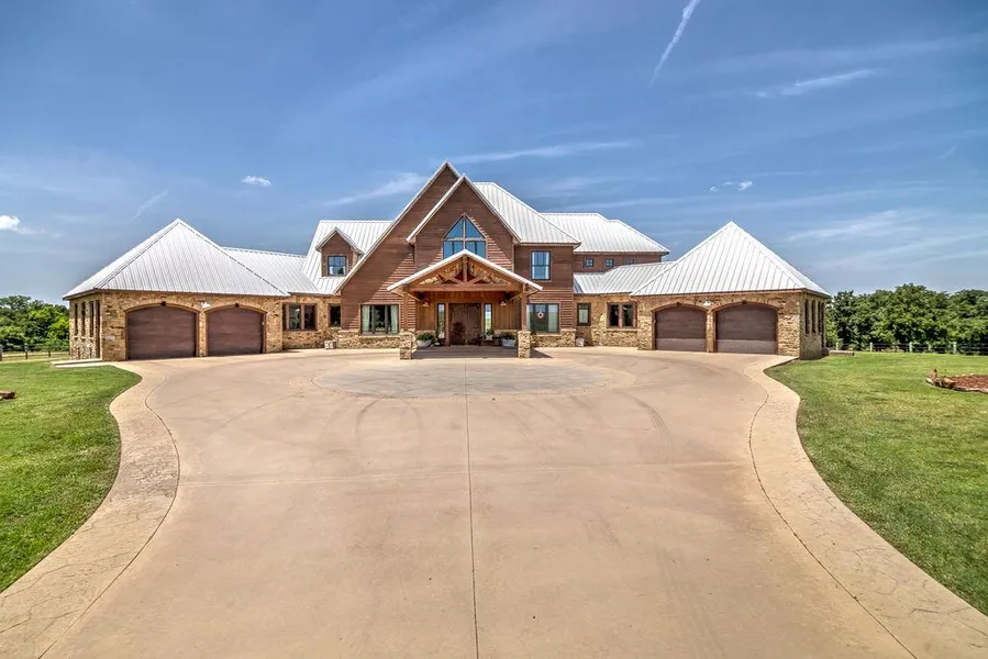 The residence boasts a covered circle drive and his and hers four-car garage, ensuring ample space for your vehicles and hobbies. Inside, the home is a masterpiece of craftsmanship and comfort. The double insulated structure features vaulted ceilings accentuated by hand-scraped cedar solid beams. The interior showcases Anderson windows, wood tile floors, and carpet in the bedrooms. The downstairs ceilings soar to 10 feet, while the upstairs maintains a generous 9-foot height. Shiplap and knotty pine accents add a rustic charm, complemented by two turrets and two staircases with removable gates. Intercom and Soundsystem with speakers throughout the home, including the back patio makes entertaining fun.