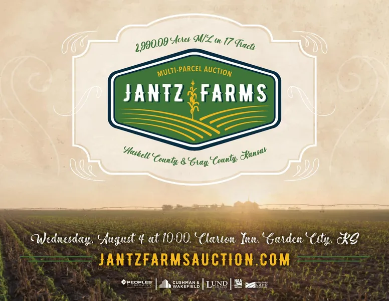 The Jantz Farms are located near Copeland, Kansas in Gray and Haskell Counties and situated just 38 miles west of Dodge City and 43 miles southeast of Garden City, Kansas. The farms will be offered in 17 tracts ranging from 1.69 acres m/l to 480.40 acres m/l via three consecutive multi-parcel auctions. The tracts can be purchased individually or any combination. Tracts 1 through 9 will be offered in the first multi-parcel auction. Immediately followed by Tracts 10 through 14, then Tracts 15 and 16. Tract 17 will be offered separately at the conclusion of the multi parcel auctions as a single tract. Jantz Farms is comprised of 2,990.09 acres m/l of which FSA certifies 2,781.29 acres m/l as tillable with 458.17 acres m/l enrolled in CRP that have annual payments totaling over $20,841. Primary soils include the highly productive Richfield and Uly silt loam. The Jantz family has built extensive water rights over the years which authorize approximately 2,603 acres m/l to be irrigated through 18 well-maintained pivots. The Jantz Farm has numerous improvements including a large acreage with a 4 bedroom, 3 bath home; a farm headquarters that includes approximately 150,000-bushels of grain storage with multiple large machine sheds; and a 273,000-bushel grain storage facility conveniently located along US Highway 56. The entire farm is conveniently located near US Highway 56 with quick access to multiple grain marketing options including ethanol plants, cattle feedlots, and dairies.