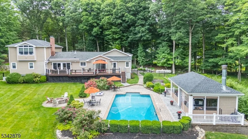 Welcome to 3 Decker Lane, a custom-built masterpiece offering unparalled luxury, modern amenities and an incredible outdoor oasis! Set on a beautifully landscaped 2-acre property with pool & pool house, this exquisite 4-bedroom, 4-bathroom home offers elegance and modern comfort with hardwood floors, custom built-ins & high-end finishes. The gourmet kitchen is a chef's dream & boasts custom walnut & white oak cabinetry, granite countertops & top-tier appliances, flowing into a sunlit dining area with wet bar and access to the Trex deck. A spacious family room features a brick WB fireplace & french doors, while the formal living with striking stone gas FP and dining rooms exude sophistication. An elevated media room includes built-in cabinetry, stero surround, radiant heated flooring, full bath & laundry. Two primary suites provide luxurious retreats, with the second-level suite offering skyline views, 2 spacious walk-in closets & spa-like ensuite with double vanity, quartz countertop, soaking tub&shower. Two additional first floor BR's share a hallway bath.The backyard is a true paradise with a newly lined heated pool, fire pit, lush gardens, and a pool house featuring WB stone fireplace, full-service bar & outdoor kitchen. Additional highlights include a mudroom, two-car garage, whole-house generator, new well pump, Anderson windows & doors. This exceptional home has it all! Experience the best of Boonton Twp including a top rated school system- RVS & Mtn. Lakes High School.