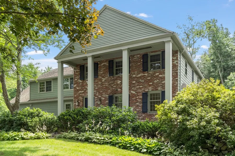 Soaring pillars on the front porch let you know this a special property. The entire lot is a visual feast of gentle sloping green landscape with carefully placed flower gardens providing an aura of serenity. The beautiful pool is carefully placed in the yard.Inside, is a large liv rm w bay window framing a lovely garden. The din rm holds a large table & built in hutch The eat in kitchen has ample counter space of granite w tile back splash & cork flr for comfort, which opens to a cozy fam rm w brick hearth &working fireplace. Lovely main bedroom has twin closets, alcove for the bed & a private deck with steps down to the back yard & pool. The main bath has a jacuzzi , shower & vanity. A 2nd large bedroom has hardwood floors, twin closets & adjoining full bath. Two more bdrms complete the 2nd flr. Per seller, the seller owned solar panels(included) produce enough power to cover all electrical needs of seller including the pool filter with nothing owed to Nat'l Grid.Offers by 8/2, 3pm