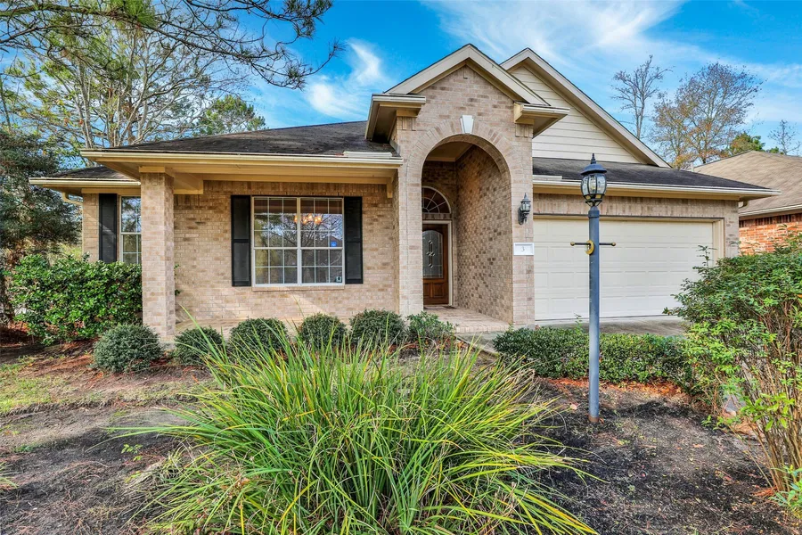 Nestled in the family-friendly Village of Sterling Ridge, this charming single-story home boasts a prime corner lot location. Its inviting open floor plan includes a front dining room, ideal for gatherings, alongside an island kitchen with upgraded stainless steel appliances and a cozy family room featuring a corner fireplace. A tranquil study offers hardwood floors and French doors, perfect for quiet work moments. The generous primary suite delights with his and her walk-in closets, a jetted garden tub, separate shower, and dual vanities. Outside, a covered back patio overlooks the spacious backyard, providing ample room for outdoor activities. Added conveniences include a standby generator system, washer, dryer, and fridge. With Coulson Tough Elementary, parks, bike trails, and a community pool just a stroll away, this residence offers both comfort and convenience.