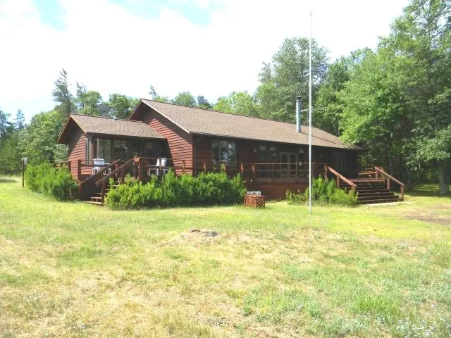 877974/47292 MINONG FLOWAGE - Wonderful location on 1700+ acres of wilderness flavor water with your ownership of some 600 of meandering level shoreline & 3+ acres showcasing a very classy Cedar look recreational residence designed for intimate single level enjoyment. Lake & woodsy views from all rooms & even the lake view Master suite consisting of spacious bedroom to 11x14 bath/dressing area to sauna & adjoining private lake view 4 season 13x13 porch. Is also a 13x14 4 season porch at other end of the residence near the 2nd bath & Junior Master with lake view. Then in between all this..a spacious Chef Delight kitchen with conversation counter & adjoining dining space. All enjoying the lake views thru the step-down living area with Fireplace. Pleasing & e.z. care landscaping leads to the 4 car sized garage & huge front decking array. $500,000