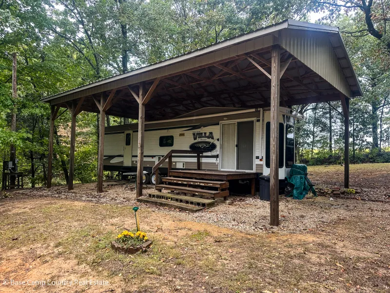 This 3.3 +/- acre wooded property consists of two parcels, 2.018 acres and 1.32 acres. It includes two county water meters, electrical service, and a septic system. The 10-year-old, 39-foot travel trailer with a 4-year-old pole structure built over it to protect it from the weather is a great place to rest after a day of fishing the nearby lakes or visiting the local attractions. Enjoy viewing wildlife from the permanent wooden deck with a morning coffee or an evening beverage.