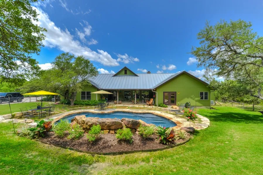 Your family will enjoy the natural beauty and tranquility of Spring Creek Estates, a small rural subdivision offering its owners a simple rural lifestyle with a passion for the outdoors, great views and quality lifestyle. The main house constructed with Lampassas stone and Stucco offers an open living concept with three bedrooms, two and one half bathrooms, rock fireplace, large covered back porch, in ground 13,000-gallon swimming pool/waterfall, gently rolling terrain and a healthy hardwood cover across the 3.4 acre landscape. An added bonus of a 500 s. f. guesthouse with one bedroom, one bathroom, standing seam roof, stucco exterior separated from main house provides multiple uses for the new owner. Additional amenities include a 4,200-gallon concrete water well cistern, a standard septic system, interior low fencing, natural landscaping and ample parking.