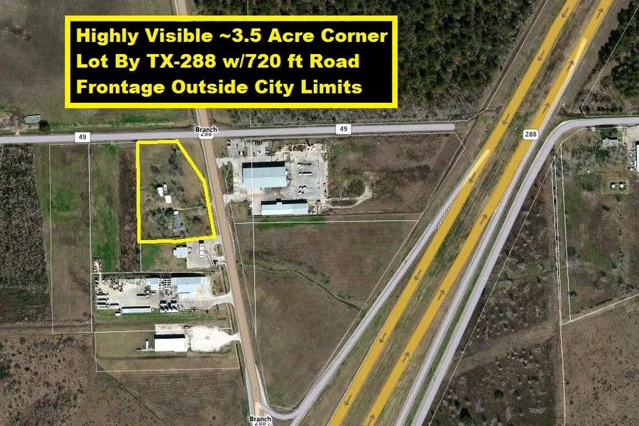 New Price! Highly Visible ~3.5 Acre Commercial Corner Lot by TX-288 & FM 521 w/720 ft Road Frontage Outside City Limits. Perfect for Gas Station, C-Store, Drive-Thru, Hotel, Warehouse/Storage, Hospital/Urgent Care, Retail Center, Medical/Dental/Animal Clinic or Commercial Business w/Billboard for Maximum Exposure. Hwy 288B is High Traffic Hwy to FM 521/TX Medical Center, Angleton, Freeport/Refineries, Brazos Bend State Park, Surfside Beach/Jetty County Park, Quintana Beach Park. Property has small home w/couple of storage buildings, but selling As-Is for Lot Value Only. Home/buildings are Teardowns & No Repairs Will Be Made. Do Not Disturb Occupants! Access to Home Not Allowed!