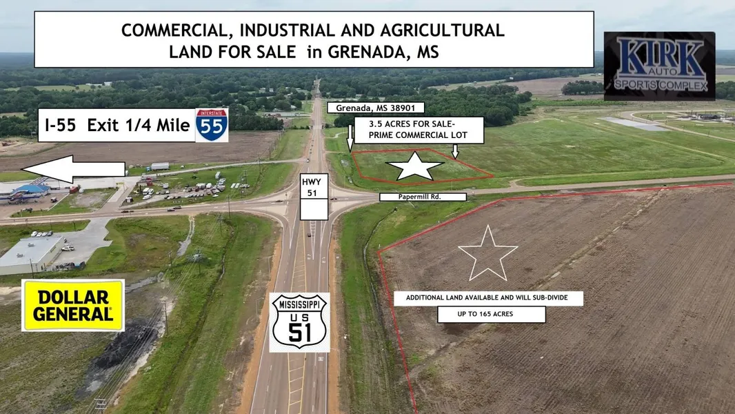 Prime Commercial Land in Grenada, MS - Highway Frontage! An exceptional opportunity for development! This expansive 3.5-acre commercial property is strategically located with prime visibility from Interstate 55 to the west and direct access along Hwy 51 and Papermill Road. Perfect for companies looking to capitalize on high-traffic areas, this property offers a wealth of possibilities for growth and expansion. Don't miss your chance to secure a key piece of commercial real estate in a prime Grenada location! North Grenada Exit at Papermill Rd.. Strong Employment Growth- The city has experienced a marked increase in employment, with 900 new jobs not yet announced and other local companies relocating up to 1,800 employees to Grenada. Grenada has also benefited from industrial developments of $550+ million along with several million in federal grants and state tax credits for the local economy. The Property benefits from the intersection of Interstate 55 (19,404K+ VPD) Development incentives may also be available from the City of Grenada. Water and Sewer Available at the Site..