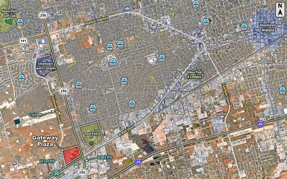 This exceptional retail development opportunity is situated in the highly sought-after Gateway Plaza, strategically positioned within the thriving Tradewinds Blvd Corridor in southwest Midland. Gateway Plaza boasts a prestigious tenant roster including Cinergy Cinemas (an 11-plex premier cinema), Hawthorn Suites, Four Points by Sheraton, and various office and retail establishments. In addition, Gateway Plaza is home to luxurious apartment complexes such as Gateway Plaza Apartments, Ventura at Tradewinds Apartments, and Tradewinds Apartments. With only two tracts left, don’t miss out on the chance to secure a prime location in this bustling commercial hub. Contact us today.