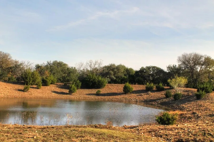Thirty tree covered acres of land out of a larger ranch with county road frontage, is currently Agriculturally exempt with a small herd of Texas Longhorn cattle. A wet weather branch runs through the front section of the property and a large stock tank supplies water to the livestock.