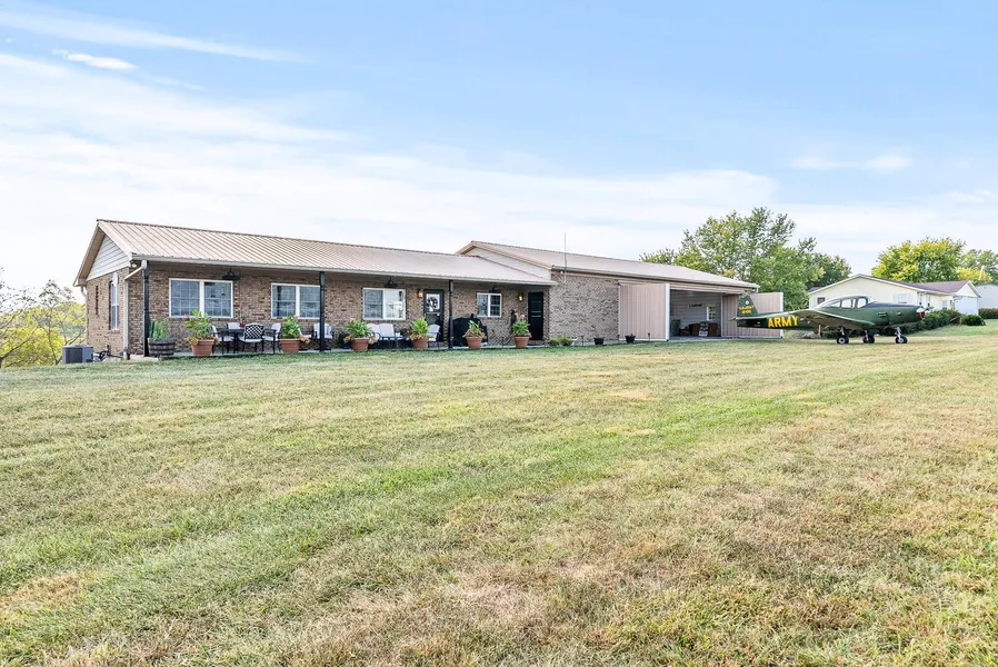 This home offers a rare opportunity for aviators seeking the perfect blend of peaceful living and the aviation lifestyle. Situated in the highly desirable Owen Air Park in northern Kentucky, this custom-built residence features its very own attached, self-owned airplane hangar-ideal for aircraft owners who value the convenience of flying straight from home. Whether you're commuting to nearby cities in the Midwest by air or just flying for fun, you'll appreciate Owen Air Park's prime location-perfectly positioned between Louisville, Lexington, and Cincinnati. With over 7,000 sq ft under roof, this impressive property includes two living spaces, a 3-car garage, and unobstructed views of the airstrip and rolling Kentucky farmland. The home's craftsmanship shines through in every detail, including the custom Amish-built solid wood cabinetry. The main level offers an open-concept floor plan, a spacious primary suite, and large windows that fill the space with natural light, creating a serene, airy environment ideal for relaxing after a day of flying. The lower level includes a separate living area, including a Jack and Jill bath between the bedroom and flex space, that could easily be enclosed, adding another bedroom. This provides a versatile bonus space perfect for guests, an office, or a private apartment setup. This is more than just a home-it's a lifestyle. Whether you're a recreational flyer or need quick access for business travel, 30 Pilots Dream Drive delivers the ultimate aviation-friendly living experience.