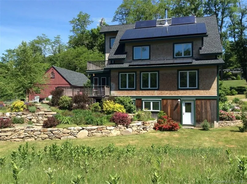 Step into this warm and inviting 3 bedroom, 2 bath contemporary Cape built with green construction techniques and you'll feel like you are living off the grid in the mountains of Vermont! Located on a quiet residential road just minutes from the center of town on a gorgeous 1.6 acre lot. Cross the babbling Gulf Stream brook and enjoy hiking, birding & serenity on over 500 acres of the Whitaker Woods/McCann Farm preserved by the N. CT Land Trust & the CT State Forest. State of the art, energy efficient construction with double-walled roof/exterior wall framing & insulation, triple-glazed casement windows with double low E coating, insulated Thermomass foundation, solar hot water and a rooftop solar array which produces power in excess of consumption! The first floor features a bright open floor plan with kitchen/dining room, an office, large living room w/wood stove overlooking the nature preserve plus an enclosed porch leading to a deck and terraced gardens. There are hardwood floors throughout, a 2nd floor deck off the master and 3rd bedrooms, a 2nd floor laundry and a family room in the walk-out lower level. This home is naturally cool in the summer and warm in the winter due to its south facing orientation and 2' roof overhang. A Mitsubishi ductless split AC/Heat pump system was installed in 2016 for additional cooling power. Park your vehicles in the 2 bay traditional 22' x 36' timber-frame garage/barn with storage loft, workshop plus an attached lean-to.