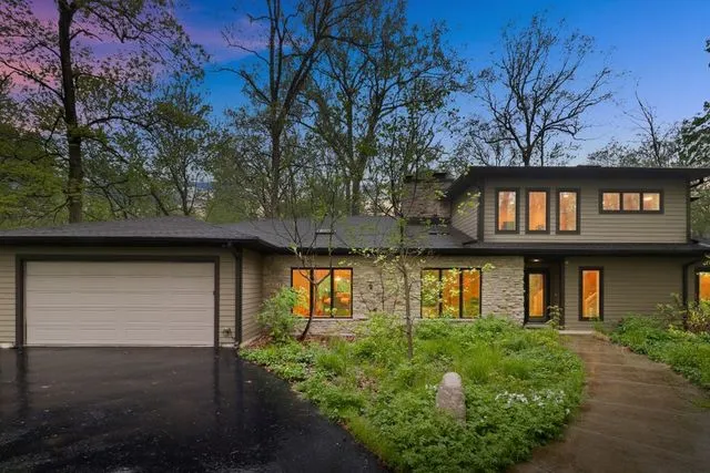 This is a WOW home...located on a private, wooded 2.3 acre parcel in Riverwoods. Views out of every window! A 900 sq ft. heated, air conditioned outbuilding w/ half bath currently used as a workshop but could be a perfect art studio, collectors garage, yoga studio, rec room - whatever! Home was completely redone in 2010 with additions creating an open floorplan, 3 car garage and first floor master suite. Kitchen refinished with high end custom pickled-oak cabinetry, large island with dual side cabinetry, double ovens. Floor to ceiling windows in living areas. Trex decking on three outside entertaining areas. Office space, game room/recreation area, separate laundry room&mudroom &upstairs loft. Master suite has his/her closets, sliding door leading to deck and beautiful master bathroom with large walk-in shower, separate air jet tub & his/her vanities. This home & lot provide complete serenity but yet you are still close to highway access, train stations & top ranked Deerfield schools!