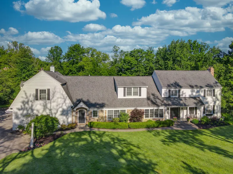 Nestled on over 3 stunning acres, this stone and frame Colonial offers unrivaled living spaces, exceptional privacy and timeless design choices. The foyer leads to the formal dining room with fireplace and formal living room w access to kitchen breakfast bar. Adjacent to the kitchen is a beautiful glass-walled dining area with views of the extraordinary yard, which opens into the spacious great room/family room with another stone fireplace. A charming porch with a wood plank ceiling, walls of windows, and yard access is perfect for summer relaxation. The expansive second floor houses a luxurious owner's suite, complete with a separate office/sitting room, vaulted ceilings, glamour bath, dressing room and two walk-in closets. Two additional bedroom suites, each with a full bath, and a bonus room that can serve as a fourth bedroom suite with a full bath and private entrance, complete this floor. Finished walkout lower level features an additional entertaining room and full bathroom. Warm weather will be enjoyed on the BRAND NEW Bluestone patio with fireplace and surrounding landscaping.