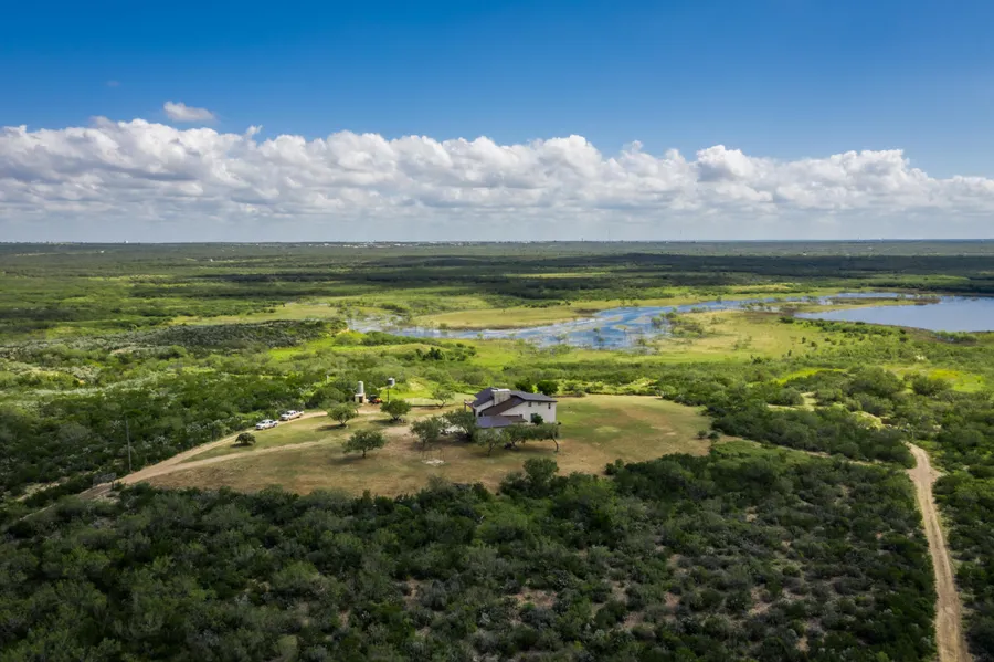 The ranch has a pretty 3656 sqft rock house that overlooks the Falcon Lake Reservoir. This home is perfect for a game ranch with plenty of rooms to sleep and a large kitchen and living room. The home features a large rock fireplace and wood accents throughout, This home sits on a 9-acre parcel that is separate from the 3,000-acre ranch but is only a short drive away,