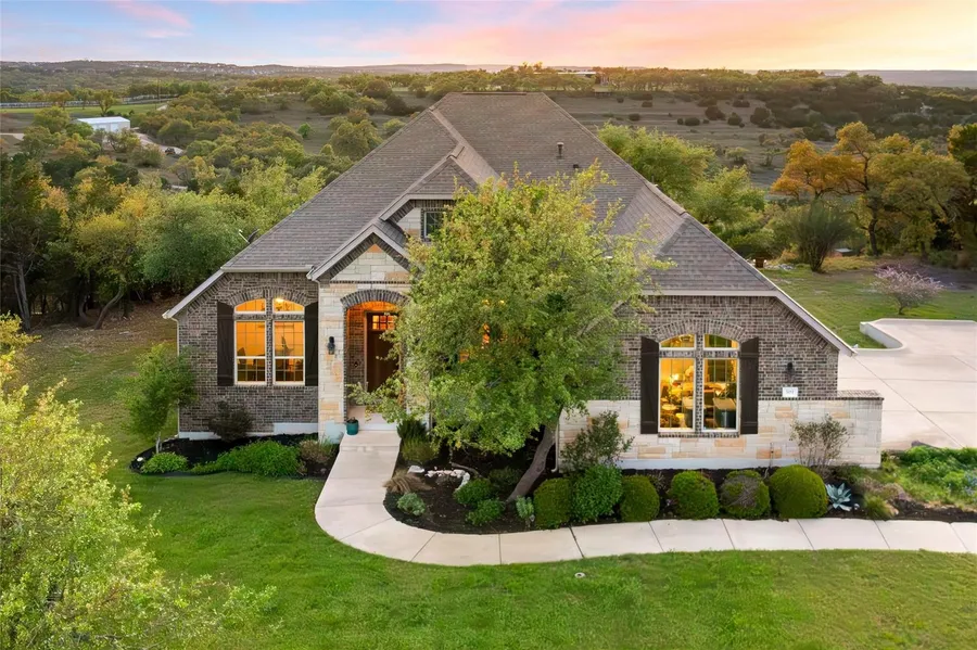 Designed with both style and function in mind, the home features 4 spacious bedrooms, 3.5 baths, a dedicated office, and a media room. The open-concept layout is anchored by a chef’s kitchen with oversized island, abundant storage, and expansive countertops that flow seamlessly into the main living areas. Walls of windows frame breathtaking Hill Country views and fill the home with natural light, creating a warm and inviting atmosphere.
