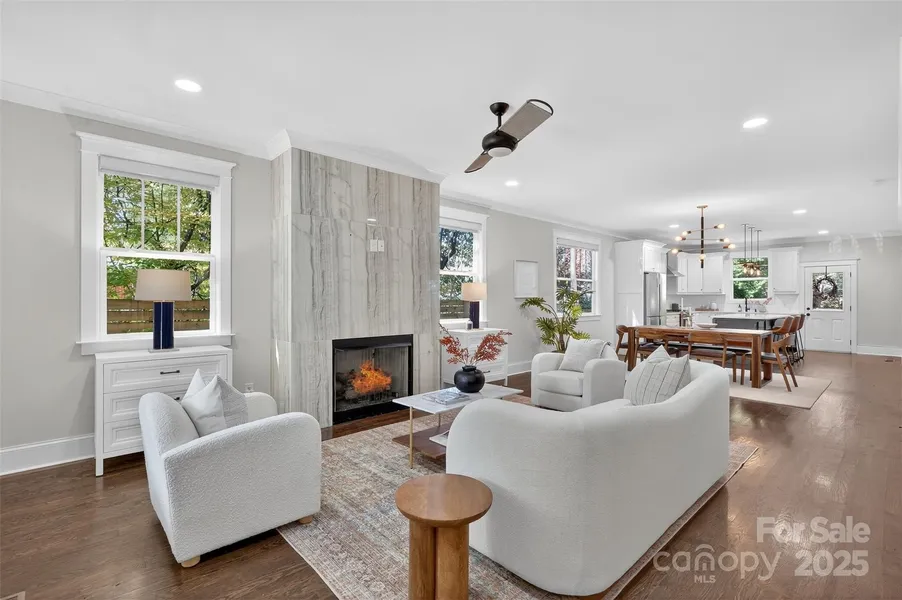 Stunning 2020 custom Craftsman in the heart of Midwood, just steps from NoDa and Central Ave! This home perfectly blends modern comfort and design, featuring an open floor plan ideal for entertaining. The gorgeous kitchen offers a large island, handcrafted cabinetry, quartz countertops, gas range with hood, stainless steel appliances, and overlooks the light-filled living room with a beautiful gas fireplace. The primary suite is conveniently located on the main level, complete with a spacious sitting area, spa-like bath featuring a freestanding tub, frameless glass shower with dual shower heads, double vanity, and custom walk-in closet. A main-level laundry room with drop zone adds everyday convenience. Upstairs, you'll find a bright loft area perfect for an office or lounge, three generous bedrooms, a full bath, and an additional laundry room. Additional highlights include site-finished hardwoods throughout, dual HVAC, on-demand hot water, sealed crawl space, large fenced backyard, and an attached two-car garage with circular front drive. The perfect home in the perfect location-truly one of a kind!