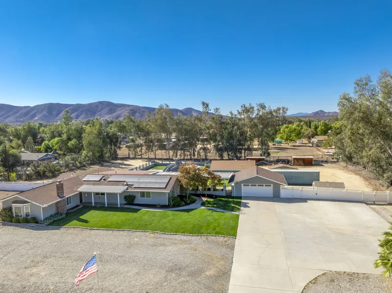 Private Ranch Estate on Over Two Acres Zoned A-1. Experience the best of country living with modern convenience at 30245 Santa Fe Street. This spacious single-story home sits on more than two acres of usable land offering wide-open space, privacy, and multiple improvements ideal for entertaining, multi-generation living, or hobby use. Interior Features: Bright and inviting floor plan with expansive living and dining areas, large kitchen with generous cabinet space and breakfast bar, walk-in pantry, 6 bedrooms and 3 bathrooms to accommodate family or guests, durable tile and laminated flooring throughout for easy maintenance, inside laundry, Energy-efficient home equipped with solar system for the residence. Outdoor Living: Sparkling in-ground pool with LED lights with a separate solar heating system for year-round enjoyment, spa, surround sound in pool area, detached pool house with a bathroom — perfect for guests, home office, or studio use. An outdoor shower. Expansive covered patio with built-in-bbq, ideal for outdoor dining and relaxing with a fire pit. Additional seating area near the pool with an outdoor fireplace. Multiple RV hookups. Level 2 EV charger in the garage. Multiple storage units and outbuildings for tools, hobbies. Horse shed/corral. Wide driveway and gated access with plenty of room for RVs, boats, and trailers, fully fenced property with usable land — great for animals, gardens, or expansion. Multiple fruit trees and a beautiful rose garden. Additional Highlights: Two solar systems (home + pool) to help lower energy cost Located in a quiet area of Hemet with easy access to shopping, schools, and major roads. Summary: Single-story | Dual solar systems | Pool & Spa | Pool house w/bathroom | Multiple storage units | 2+ acres | RV parking | Horse Facilities
