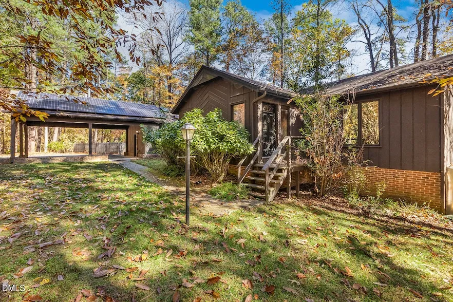 Endless potential awaits on this beautiful 3.1-acre wooded property with a pond in Raleigh! Tucked away on a quiet street yet minutes from city conveniences, the perfect opportunity to renovate or rebuild your dream home. The existing residence features rustic character with wood siding, brick accents, and solar panels ready for your vision and updates. Enjoy peaceful surroundings, mature trees, and tranquil water views. No HOA and plenty of space for gardens, workshops, or expansion an ideal setting for those seeking privacy and natural beauty close to everything Raleigh offers. Home is being sold as-is.