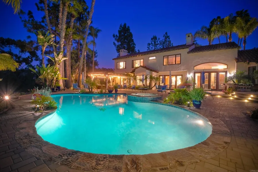 Welcome to 3028 Paseo Cielo!! This 6-bedroom, two-story, 2+ acre home is ideal for the sophisticated buyer looking for a tranquil and private upscale lifestyle in Rancho Santa Fe. This distinctive property located at the northwest corner of Rancho Santa Fe is situated on a cul-de-sac in the gated enclave of South Pointe Farms, a community that consists of only 52 custom homes on large parcels of land in the sought-after 92067 zip code. Mediterranean architectural detailing designed by Alex Friehauf, the home sits high on a hill and includes soaring ceilings, indoor arches, French doors, open beams, and skylights, and an incredible view. Hot air balloons propelled by ocean breezes fly over in the evenings. Enjoy a sense of openness in a tropical resort-like setting that entices indoor/outdoor living just minutes from the beach, shopping, dining, and outdoor recreation in an equestrian-friendly neighborhood with access to horse trails. After passing the bouquet of roses and flowering plants, enter the house through an impressive arched front door that is surrounded by custom ocean motif, stained glass. Numerous palm, olive, and fruit trees, birds of paradise populate the property and an extensive xeriscape garden attracts birds and butterflies. Entertain family and friends beneath the large back yard pergola and enjoy the spacious patio and aqua spa and pool boarded by plant/flower cut-outs. Other pluses include sophisticated outdoor lighting, multi-lighted bar countertop, custom built-ins, high-end kitchen appliances, stone and ceramic tile fireplaces, solar panels, an attic circulating fan, new roof, custom wooden 3-car garage doors, wrought iron railings and outdoor fencing, a tankless water heater, finished garage, water softening system, room for a guest house, and a low HOA fee. This is truly, a unique opportunity in Rancho Santa Fe that cannot be missed.