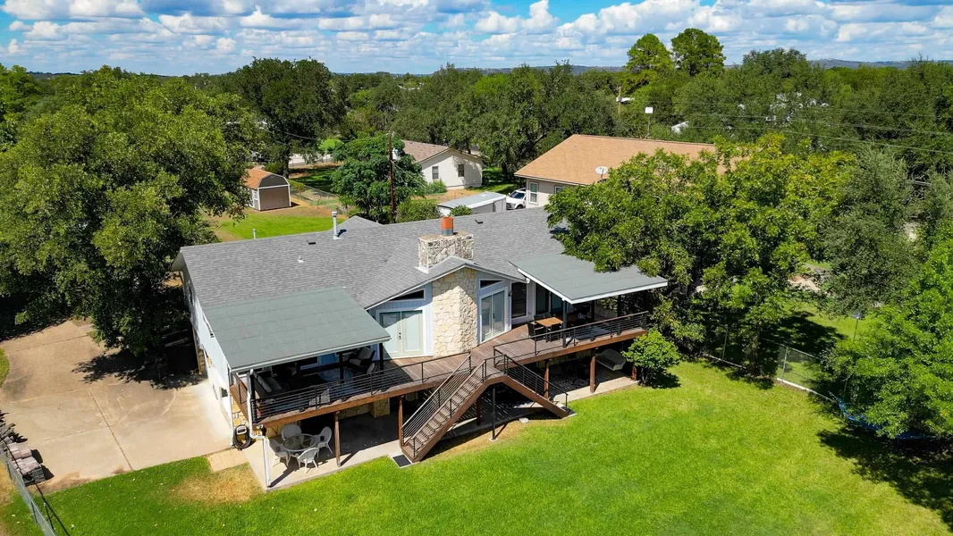 Welcome home. Make your lakehouse dream a reality. Turn key ready for the upcoming holidays! Comfortably sleeps 12. This jewel includes 2 separate living areas for additional space and is completely furnished and ready for your family and lots of guests. The huge yard ( over 1/2 acre) allows for more privacy . There are 86 feet of waterfront footage with 2 electric boat lifts, a sprinkler system, well maintained yard and a huge garage area as well. Boat dock has it's own sink for easy fish cleaning. Upstairs this lovely home has 2 bedrooms with each having it's own bath. Both bedrooms open up to the upstairs patio to enjoy the view of open water on Lake LBJ. There is outside dining areas on the both back patios. The owners suite is large enough for an additional office space and the bathroom offers 2 sinks, a tub and a shower. New water heater was added in 2024. The downstairs living area has a cozy TV / gameroom area and beds to accomodate 6 adults in that area. The third bedroom is separate for the more private guests. This house is one of a kind ! All your family can fit under 1 roof. Lake LBJ is located in the Texas Hill Country and is a controlled level lake for year round fishing, and watersports
