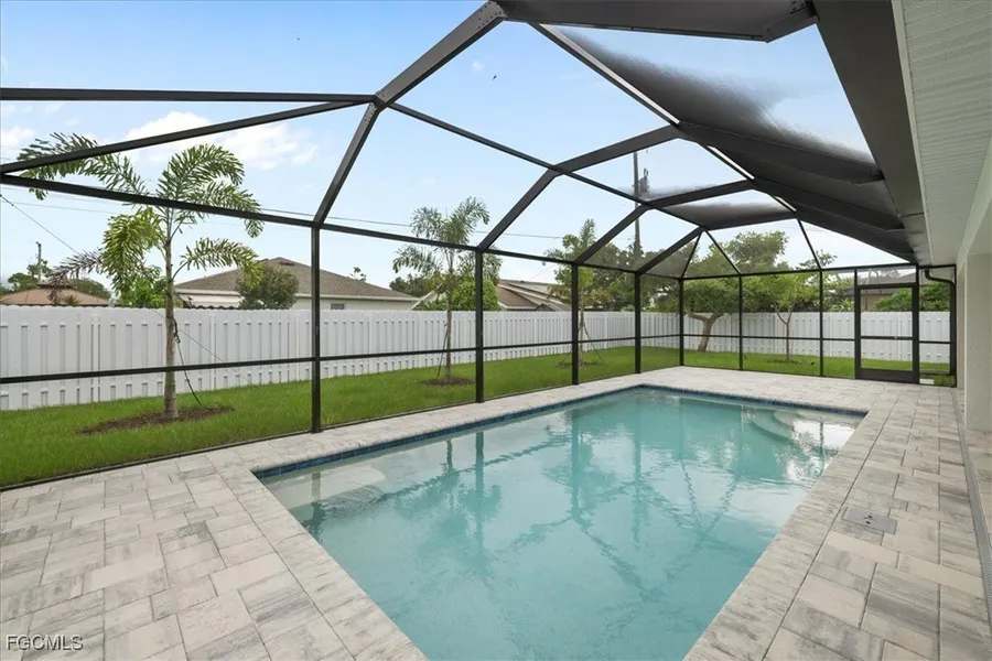 NEW FENCE JUST INSTALLED! SPACIOUS POOL HOME WITH DUAL PRIMARY SUITES! City water and sewer with ALL ASSESSMENTS PAID! Welcome to the Paradise Cove Plan-a stunning, expansive retreat designed for comfort and elegance! This huge 4-bedroom, 3-bath home boasts two luxurious primary suites, making it perfect for multi-generational living or accommodating guests in style. Step inside to discover an open-concept great room with soaring ceilings seamlessly blending indoor and outdoor living. The heart of the home is the gourmet kitchen, featuring soft-close, all-wood cabinetry, quartz countertops, stainless steel appliances, and an oversized walk-in pantry-a dream for any chef! The first primary suite is a private oasis, spacious enough for a king-size bed and a cozy seating area. Enjoy direct access to the lanai and pool, plus a spa-inspired ensuite with a freestanding soaking tub and separate shower. The second primary suite is equally impressive, offering a full bath that also serves as a convenient pool bath, along with a generous walk-in closet. Outside, relax on the lanai or take a dip in the heated pool, perfect for year-round enjoyment. Built by a trusted local builder, this home offers incredible value in Cape Coral with impact windows for added security and lower insurance costs, no flood zone offering peace of mind and savings, and a 10-year structural warranty for long-term confidence. This is The Paradise Cove Plan.