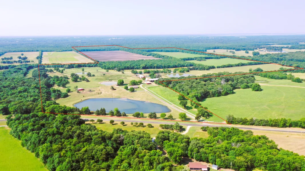 With approximately 85% pasture areas and most pastures sprigged with Jiggs Bermudagrass, there is a total of nine ponds on the land ranging from small to the three-acre lake with fishing and kayaking seen from FM 895 and many scattered shade trees throughout. The ranch is complete with a 50x120 hay shed, barns, sheds, outbuildings, and corrals.