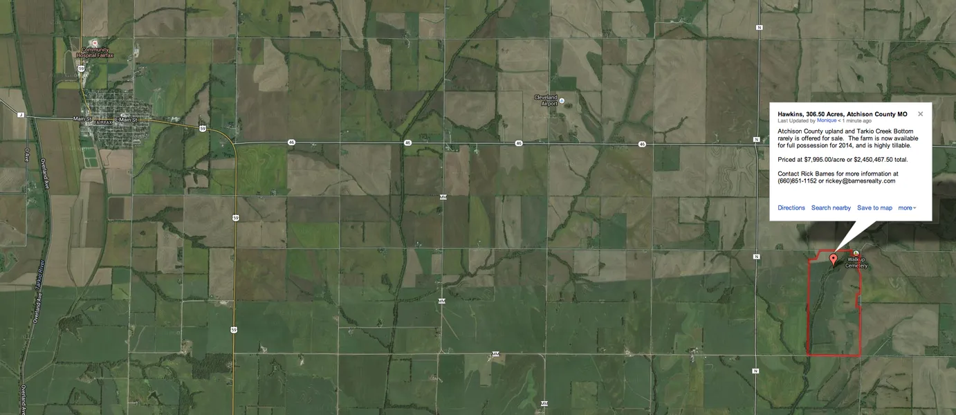 If you're looking for a really good row crop farm in northwest Missouri, take a look at this Atchison County tract! Its presently got over 200 acres of prime Tarkio Creek Bottom, 9.6 acres of CRP buffer strips, and about 60 acres of pasture, (approximately 40 acres of this could be put back into row crop). The balance of the farm is timber and ditches and lots of good tillable land could be reclaimed with a little clean up work. It's one of those farms that can be greatly improved with a little tender loving care.