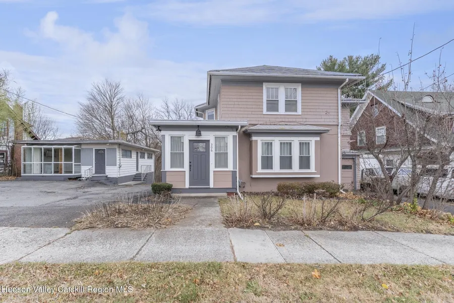 This spacious and meticulously maintained home blends classic charm with thoughtful modern updates. The kitchen and eating area feature engineered hardwood floors, quartz countertops, a farmhouse sink, extensive stonework, all-new cabinetry, and new appliances. Partial seasonal mountain views can be enjoyed right from the kitchen sink. The first floor layout includes a large living room leading to the formal dining room with built in cabinetry. Hardwood floors, french doors, high ceilings, stately staircase and original wood moulding throughout all add to the old world charm of the home, The main level also offers a convenient half bath, a bedroom, interior access to the one-car garage, and a three-season porch that leads to the front yard.-----Upstairs are four additional bedrooms and two full baths, both with ceramic tile flooring. Newer replacement windows, hardwood flooring, high ceilings, and beautiful wooden handrails make the upper level bright, spacious, and comfortable.-----The clean, dry basement provides abundant storage, a workshop area, and a washer and dryer. The large, deep yard offers excellent space for gardening enthusiasts. A long driveway accommodates multiple vehicles, complemented by an additional second driveway connected to the garage. An alarm system is already installed for added peace of mind.-----Included in the sale is a separate 1-bedroom, 1-bath cottage formerly used for commercial purposes such as a dentist's office and a bridal shop offering incredible potential for rental income, home office, studio, or retail business use.-----This home offers exceptional character, modern amenities, and rare flexibility with the additional cottage. Ready for its next owner to enjoy!