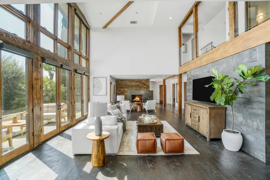 Beautiful and Stunning Custom Contemporary Ocean View home located on top of a private drive well above the street. This three bedroom, three bath with an additional first floor office that doubles as a fourth bedroom artist's home features authentic wood floors, vaulted ceilings, a spectacular open floorplan, glass second floor cat-walk, a modern solid wood kitchen with professional stainless steel Viking Pro appliances, quartz counters, double sinks, a separate utility room, a three car garage with EV NEMA 14-50 charging, central A/C, all on a usable 20,576 square ft. lot. This home was meticulously remodeled to the finest standards to create a completely usable home and yard that flow seamlessly. The great room wall of glass opens to the handsome oversized pool and fountain spillway spa, a large patio for entertaining and private terraced Lombardy deck surrounded by mature junipers. The three additional ocean and harbor view bedrooms are upstairs, The huge primary walk-in closet is almost as large as the primary bedroom itself, tons of natural light and two with their own Verona balconies with glass railings. On a clear day you can see all the way past Newport Beach. The third car garage stall is currently set up as a home gym with zone A/C and heat. It can easily be converted back. This home has designer touch overload. Don't miss out on this unbelievable difficult to find Palos Verdes, Spanish contemporary masterpiece.